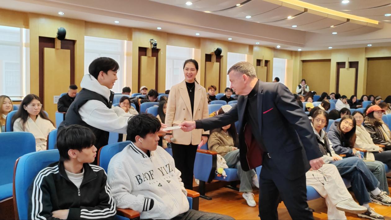 互动环节中,Phil Cleaver教授就设计师能力提升、传统文化与国际化表达的平衡、创作灵感获取等话题与师生深入交流,并分享了关于人工智能、设计研究、文化差异的见解。他鼓励师生保持设计热情,建议学生“建立明确的设计思路,通过每个项目持续学习”,并寄语师生“永远忠于自我,对万物心怀感激,在设计中永葆好奇心与探索精神”。最后为勇于提问的师生送上了带有自己亲笔签名的小礼物。