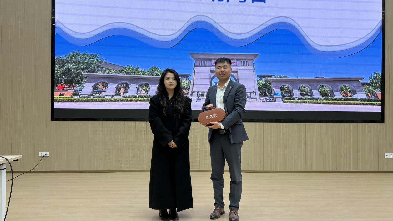 讲坛尾声,艺术学院团委书记杨瑞瑞代表学院为许修庆校友赠送了精心准备的礼物,以感谢他重返母校分享经验、助力学弟学妹成长。随后,杨瑞瑞书记做总结发言。她表示,许修庆校友的分享既有行业前沿动态,又有个人成长感悟,为同学们提供了宝贵的经验借鉴;荣康总经理的视频分享也让大家收获颇丰。同时,她对在场学子提出期望:“希望同学们以此次讲坛为契机,明确自己的学习目标与职业规划,在专业学习中既要打牢基础,也要勇于创新,在实践中提升能力,未来在环境设计领域走出属于自己的精彩道路。”