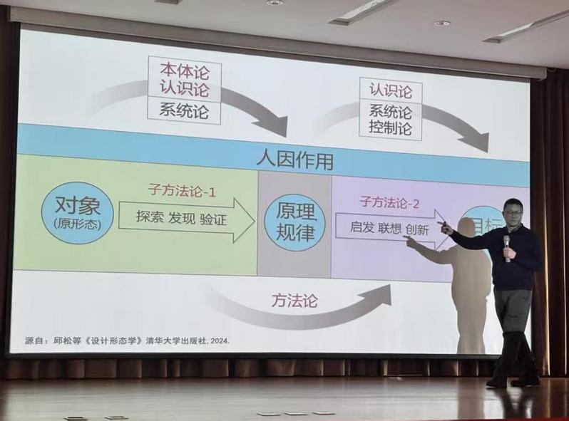讲座伊始,邱松教授系统阐释了设计形态学的核心内容。通过自然界中普遍存在的螺旋形态等案例,揭示了形态背后的规律及其向设计转化的科学路径。邱教授指出,该学科以“形态”为核心横断面,致力于探究自然、人造与智慧形态的生成原理及其与人的关系,其范式强调“明确研究核心,模糊学科边界”——以形态研究为圆心,以跨学科协作为半径,形成辐射式的创新能力。